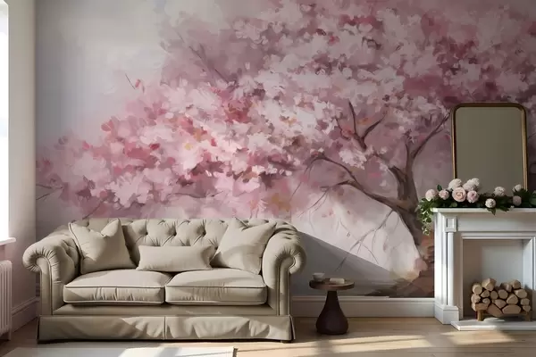 Carta da parati Albero astratto di fiori rosa in piena fioritura, accanto a un fiume, pennellate morbide e colori pastello nr. w09193