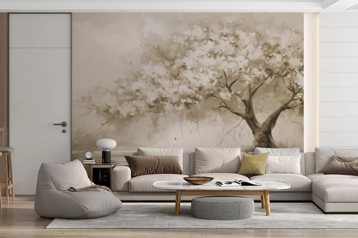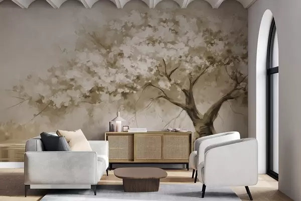 Carta da parati Albero astratto di fiori beige in piena fioritura, accanto a un fiume, pennellate morbide e colori pastello nr. w09193v1