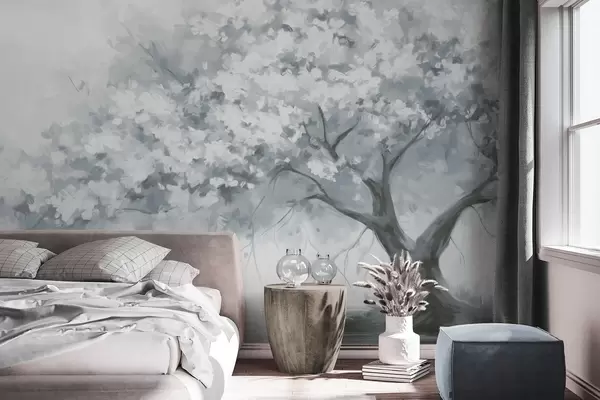 Carta da parati Albero astratto di fiori blu tenui in piena fioritura, accanto a un fiume, pennellate morbide e colori pastello nr. w09193v2