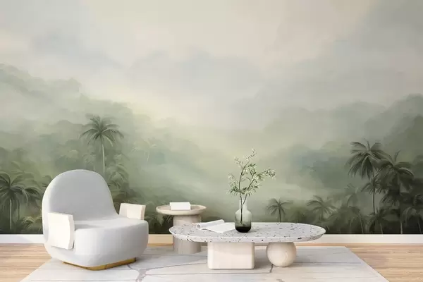 Carta da parati Paesaggio di Gungle con palme verdi e colline ondulate, colori pastello tenui, imitazione della pittura strutturata nr. w09194