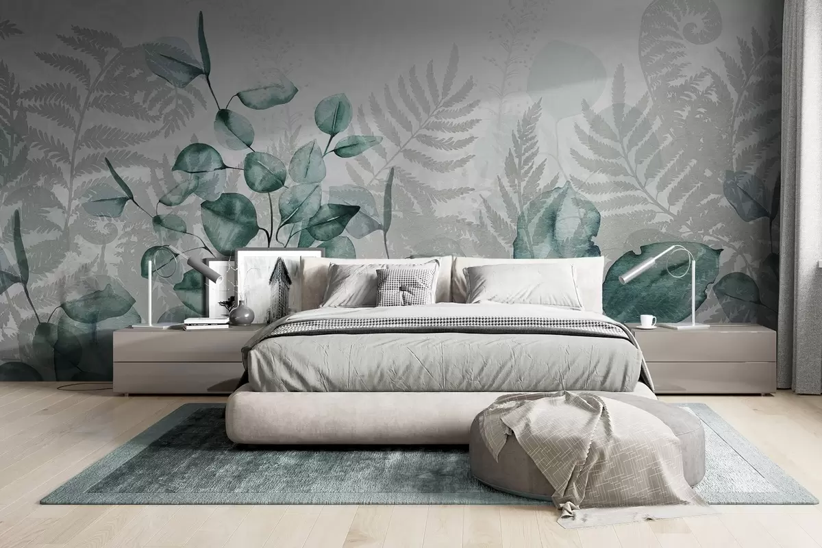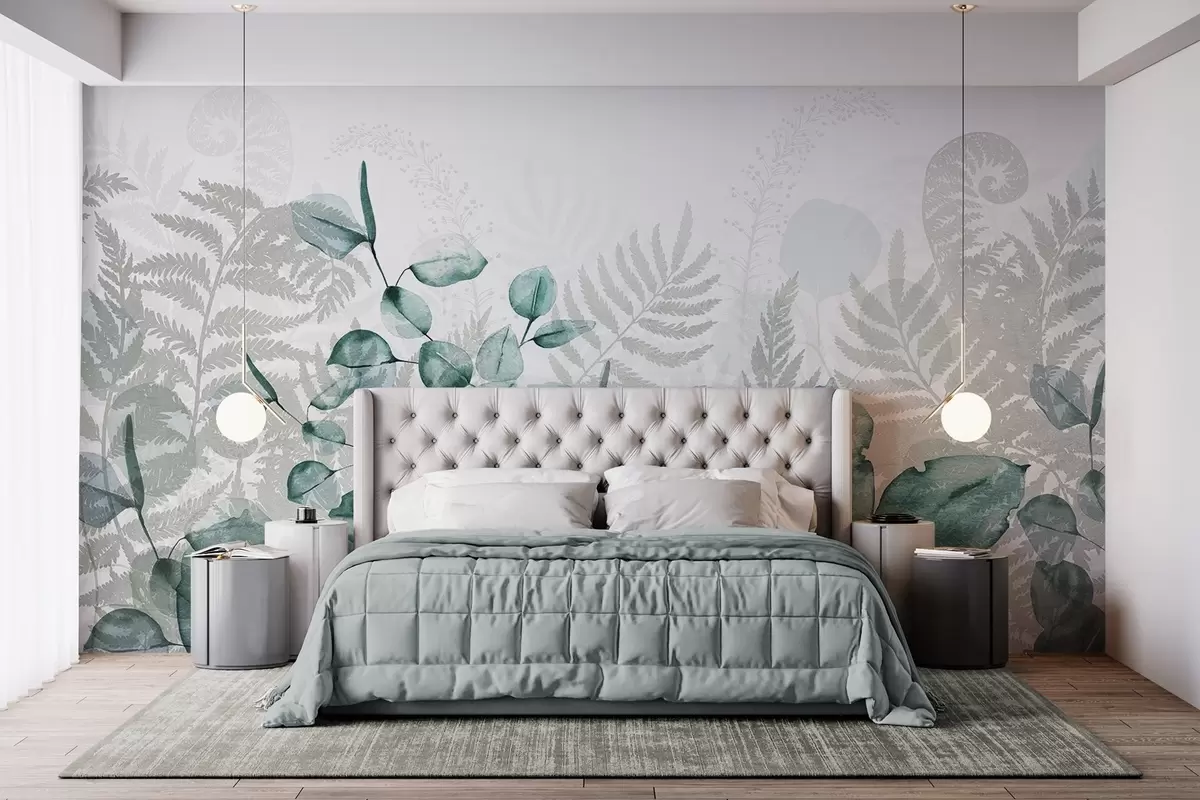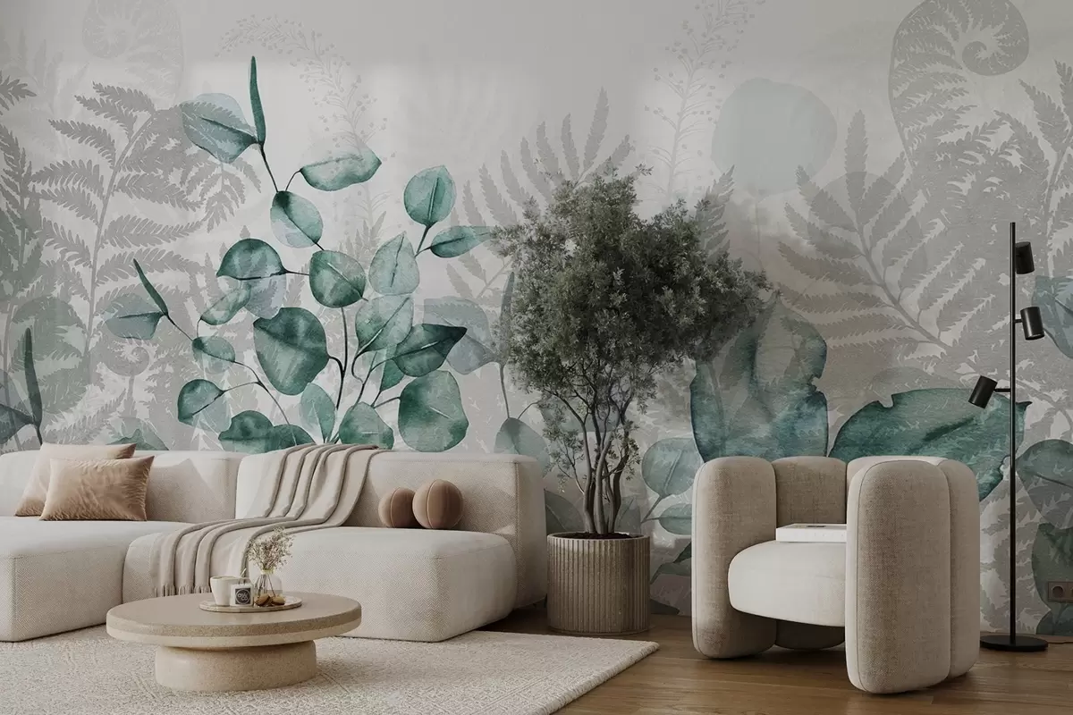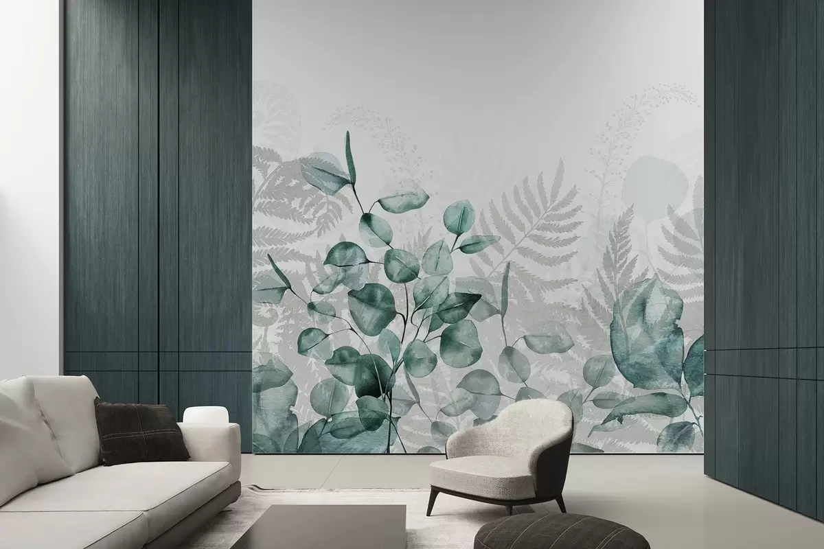 Carta da parati Foglie di eucalipto e felce nei toni del verde e del grigio, effetto acquerello, illustrazione botanica nr. w09197