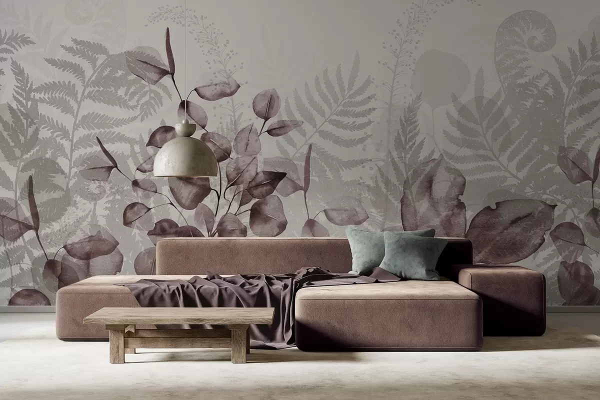 Carta da parati Foglie di eucalipto e felce nei toni del bordo e del grigio, effetto acquerello, illustrazione botanica nr. w09197v1