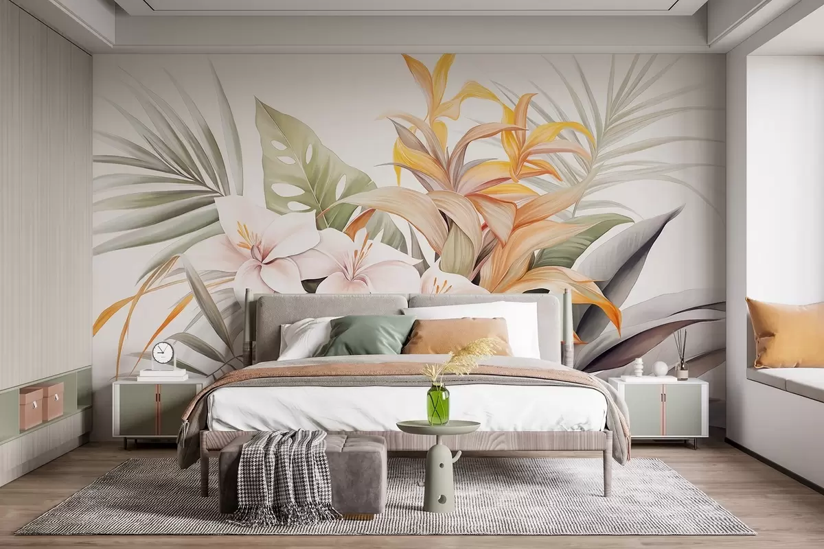 Carta da parati Illustrazione botanica di fiori tropicali con foglie di palma e monstera, colori tenui, stile acquerello nr. w09201