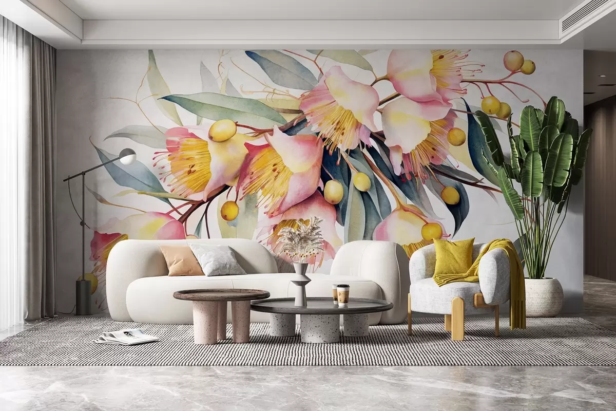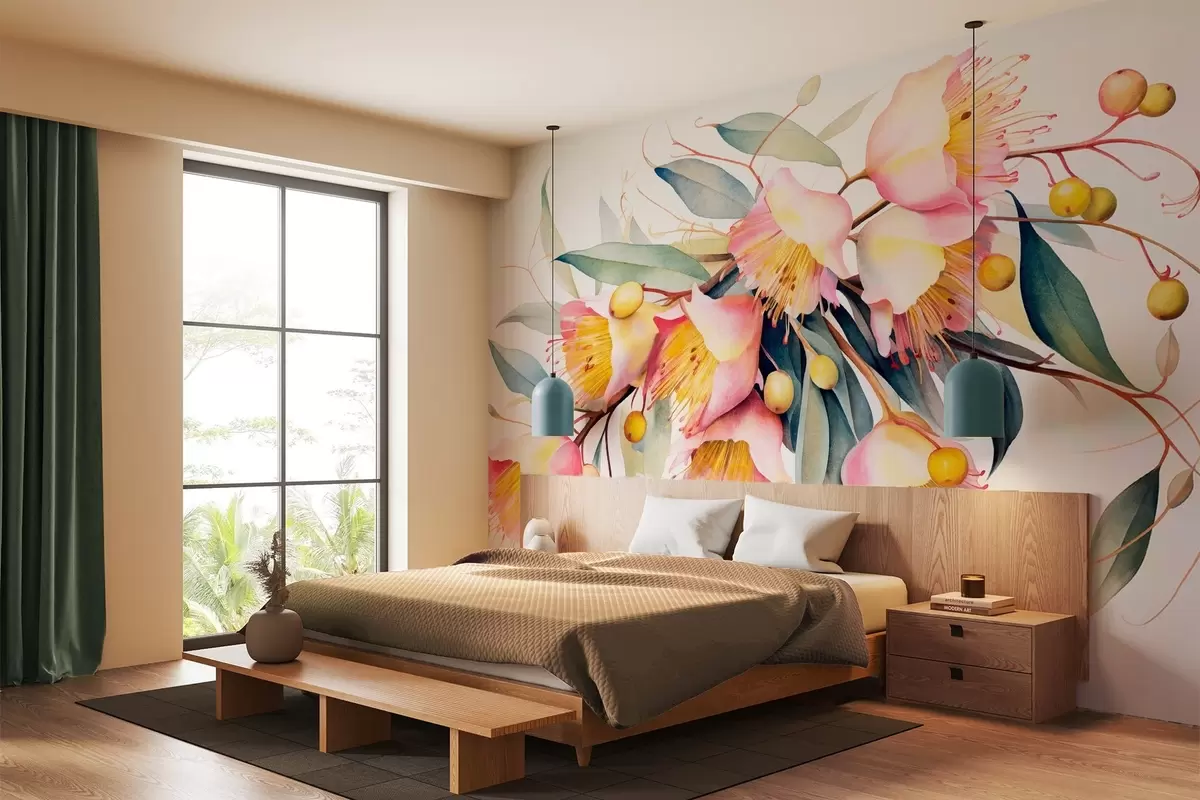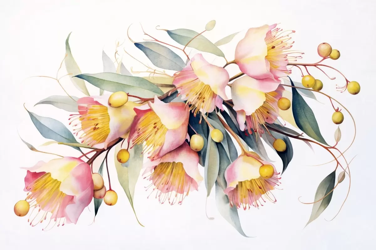Carta da parati Fiori di eucalipto con foglie verdi, stile acquerello, morbido e strutturato, sfondo chiaro, disegno floreale botanico nr. w09202