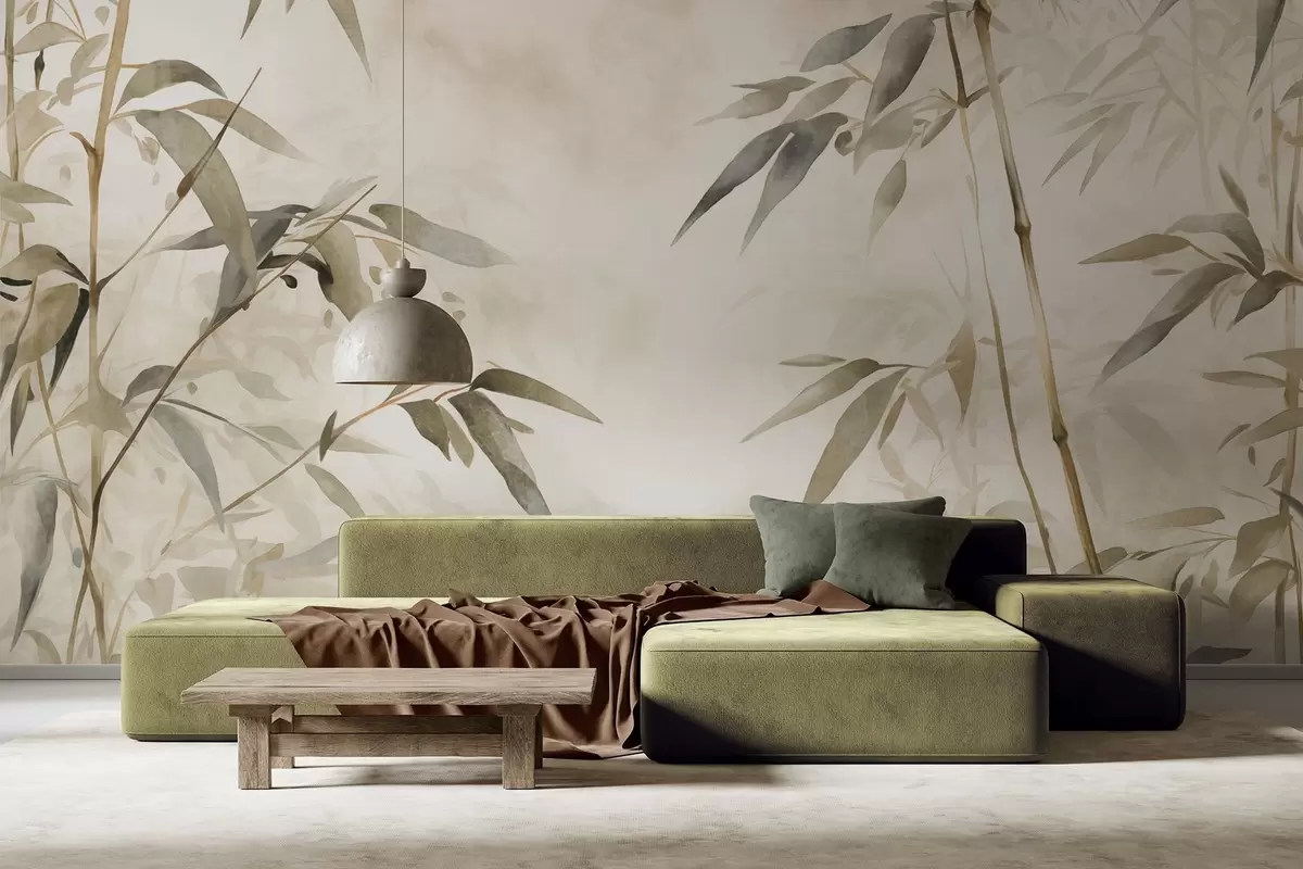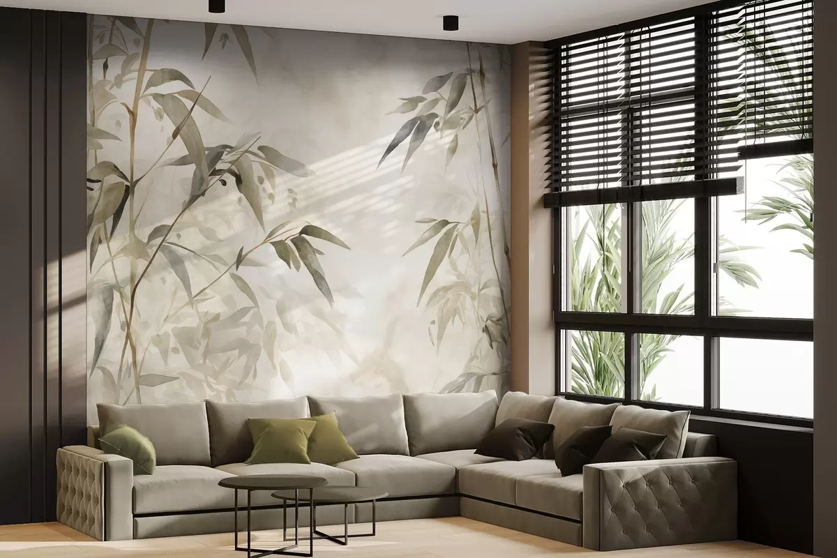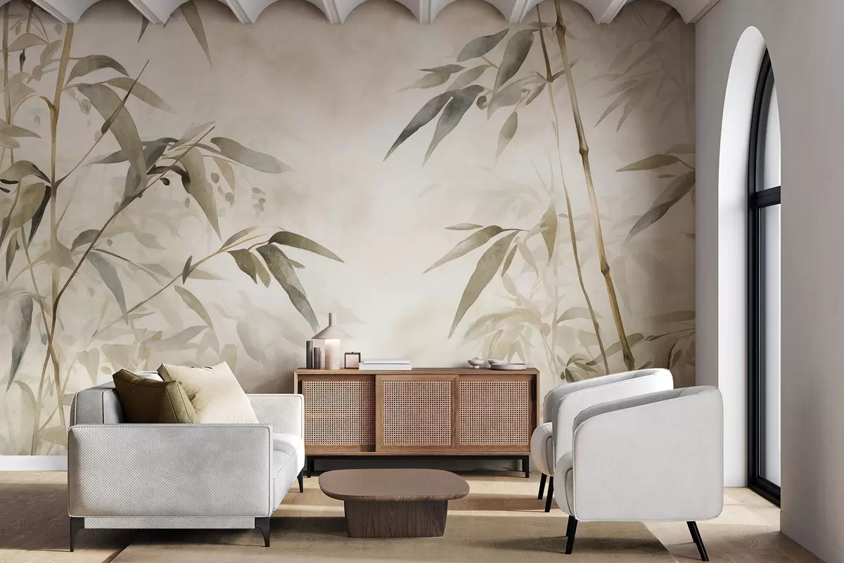Carta da parati Rami di bambù strutturati con foglie in stile acquerello, tavolozza di colori neutri e morbidi, sfondo beige chiaro nr. w09204