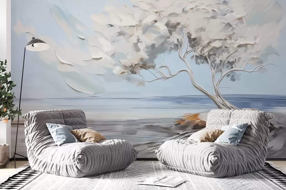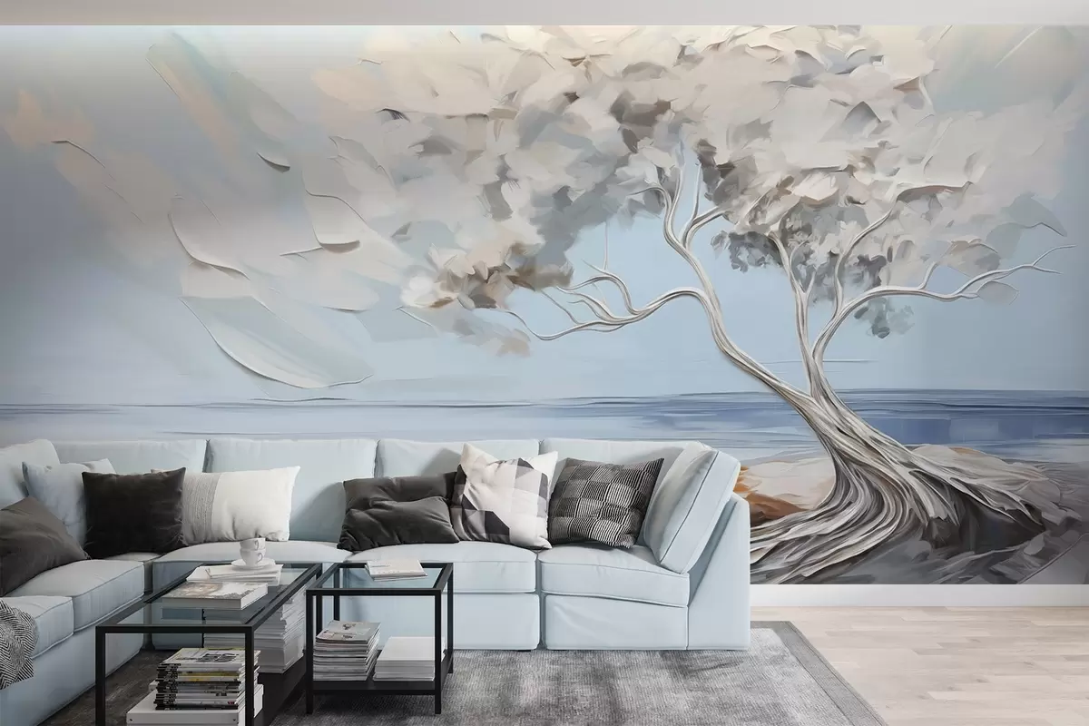Carta da parati Un albero bianco con foglie spesse e strutturate su una spiaggia sabbiosa, un paesaggio con un cielo blu chiaro nr. w09205