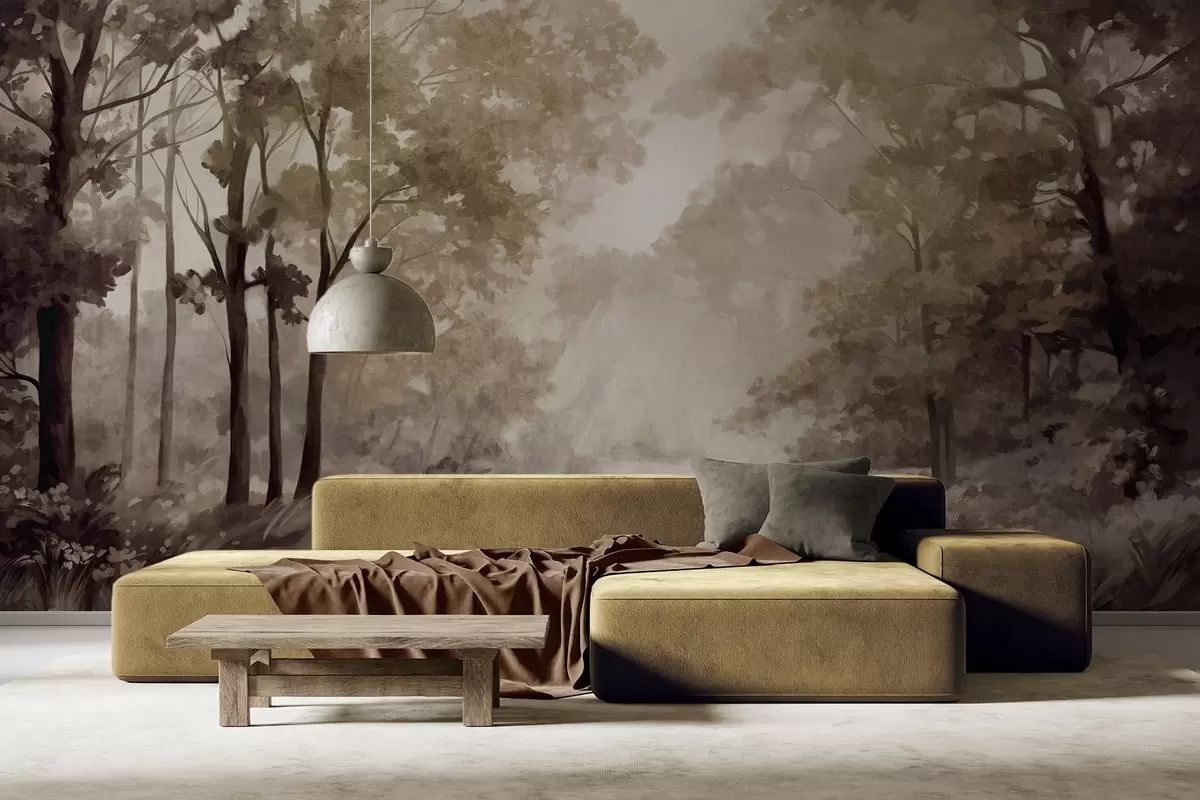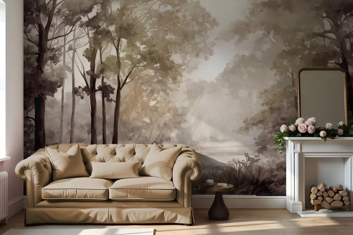 Carta da parati Paesaggio forestale strutturato, alberi con foglie beige e marroni, tavolozza di colori pastello nr. w09210