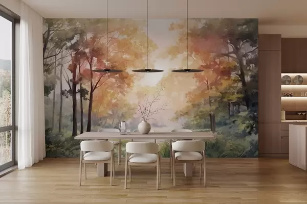 Carta da parati Paesaggio forestale strutturato, alberi con foglie arancioni e verdi, tavolozza di colori pastello nr. w09210v1