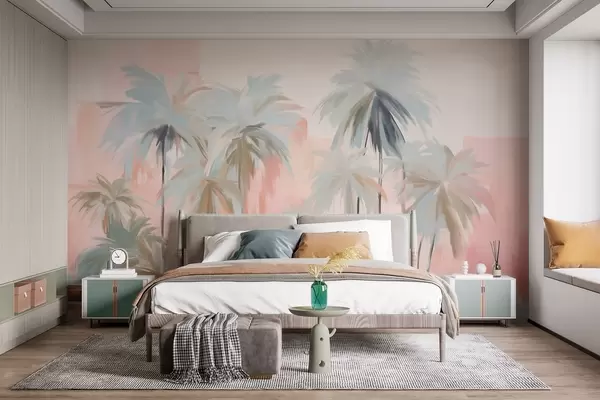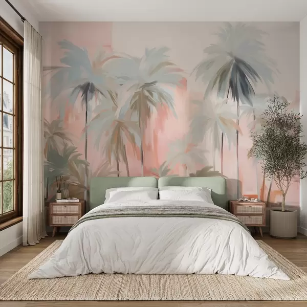 Carta da parati Palme tropicali minimaliste astratte e pastello, su uno sfondo di tonalità rosa e pesca nr. w09212