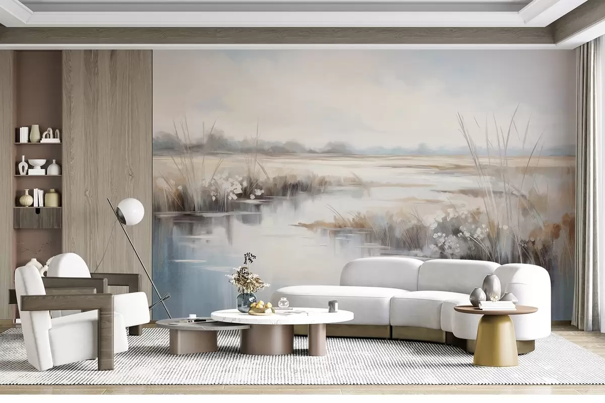 Carta da parati Paesaggio tranquillo con erbe alte e acqua calma, colori pastello tenui, alberi lontani all'orizzonte nr. w09213