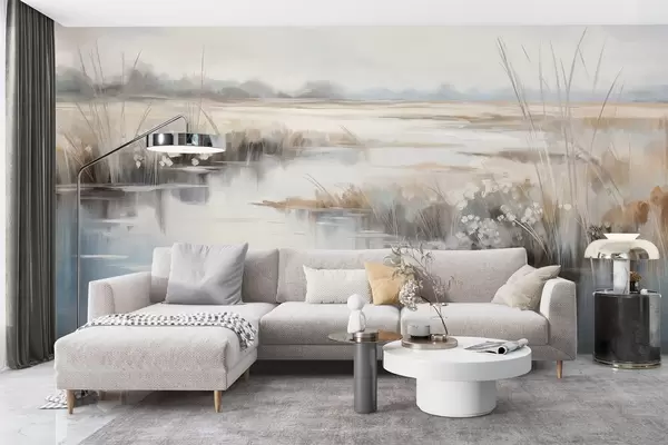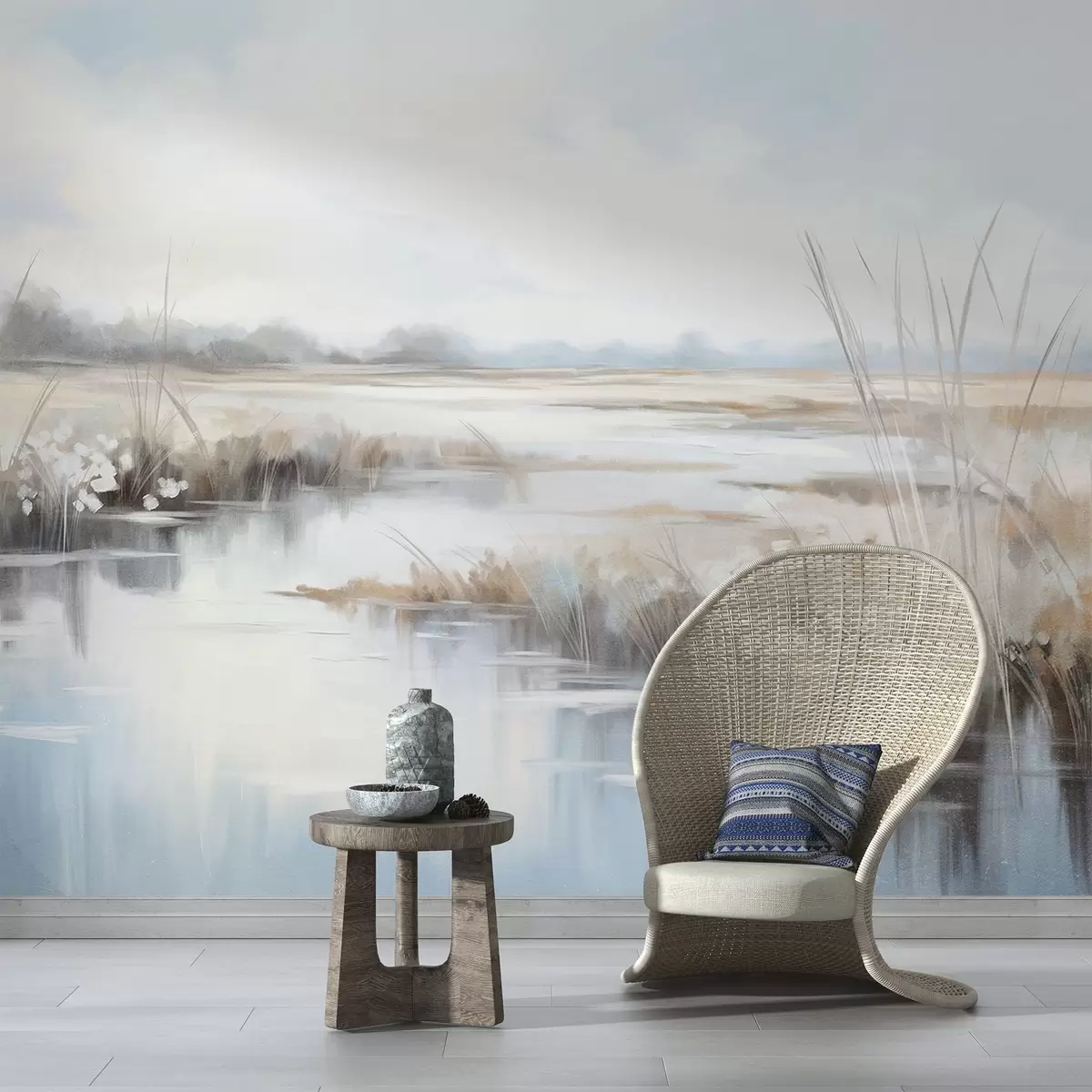 Carta da parati Paesaggio tranquillo con erbe alte e acqua calma, colori pastello tenui, alberi lontani all'orizzonte nr. w09213