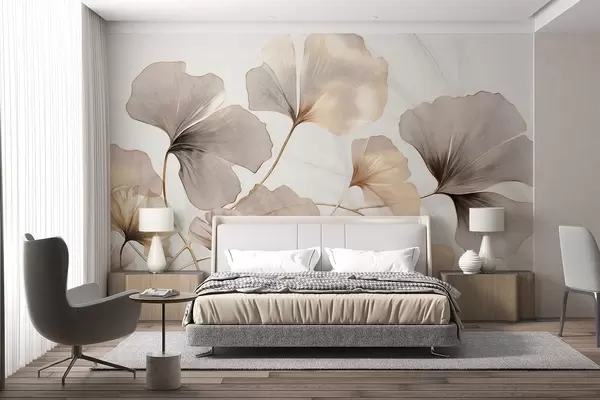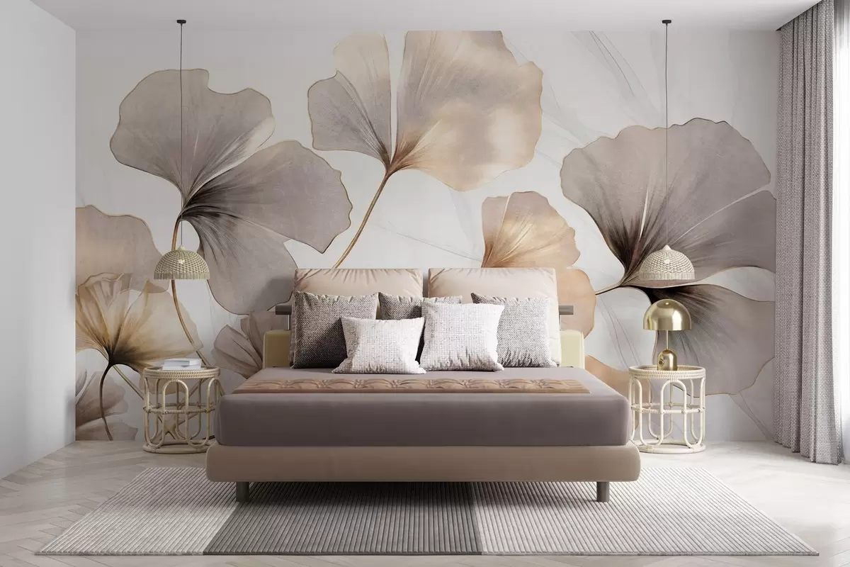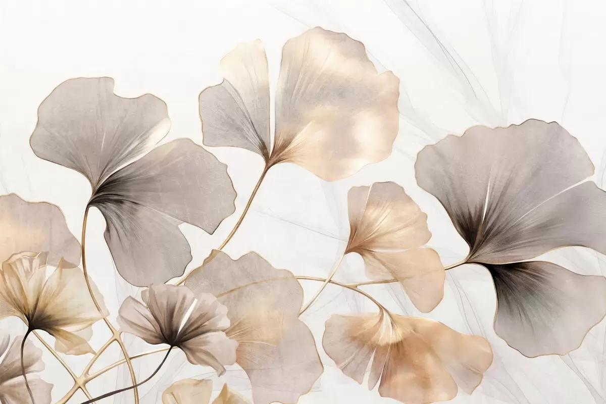 Carta da parati Foglie di Ginkgo biloba nei toni del beige, del giallo e del marrone, delicato effetto acquerello, sfondo chiaro nr. w09215