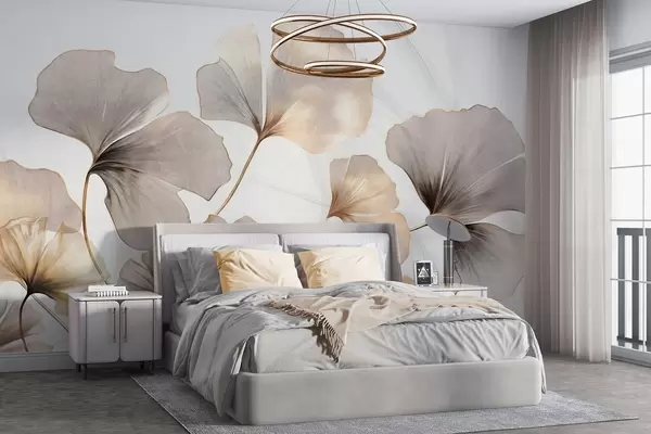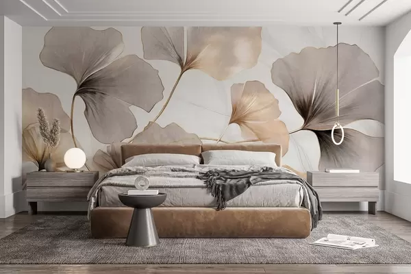 Carta da parati Foglie di Ginkgo biloba nei toni del beige, del giallo e del marrone, delicato effetto acquerello, sfondo chiaro nr. w09215