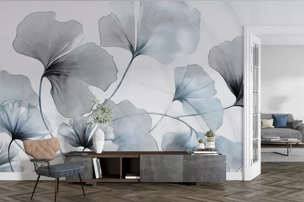 Carta da parati Foglie di Ginkgo biloba nei toni tenui del blu e del grigio, delicato effetto acquerello, sfondo chiaro nr. w09215v1