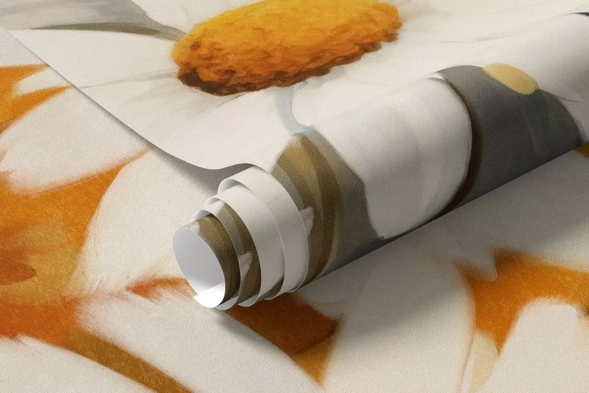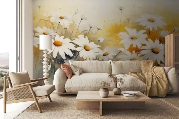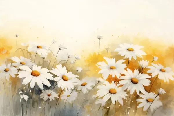 Carta da parati Un campo di margherite bianche con centro giallo, su uno sfondo giallo e beige, stile acquarello nr. w09218
