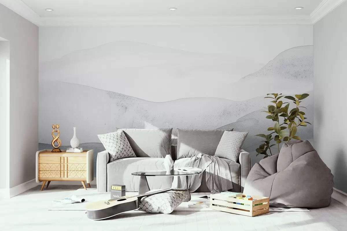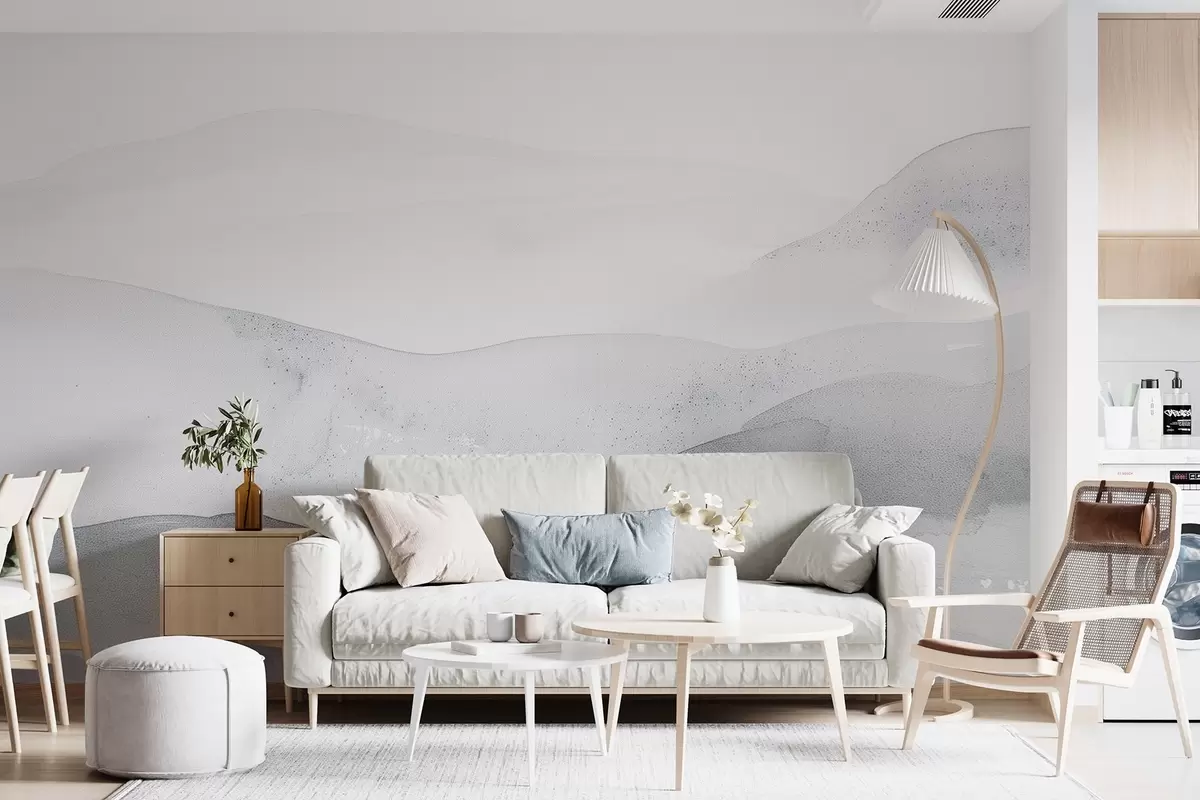 Carta da parati Montagne nebbiose minimaliste in morbide tonalità di blu nr. w09223v2