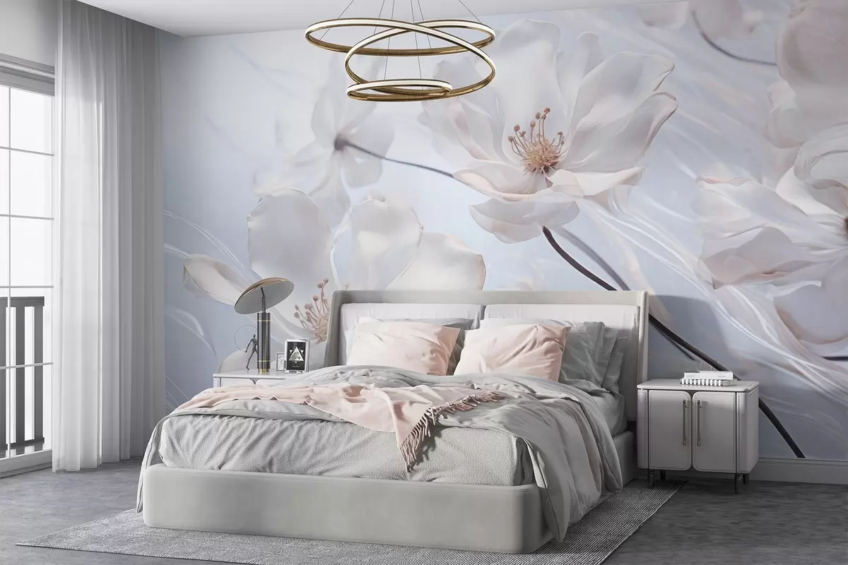 Carta da parati Fiori bianchi strutturati e trasparenti con petali delicati, sfondo azzurro tenue, elegante, romantico, sognante nr. w09233