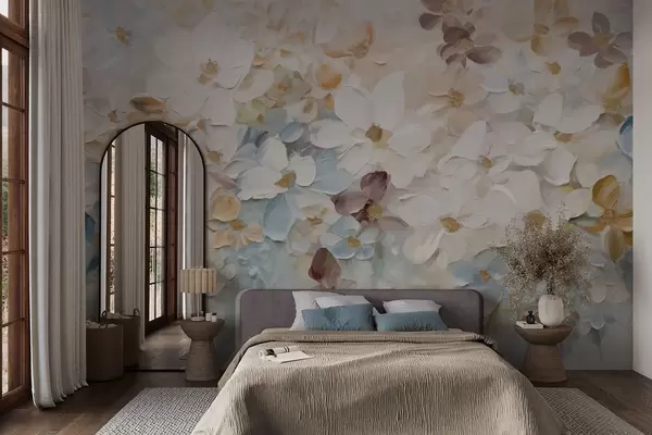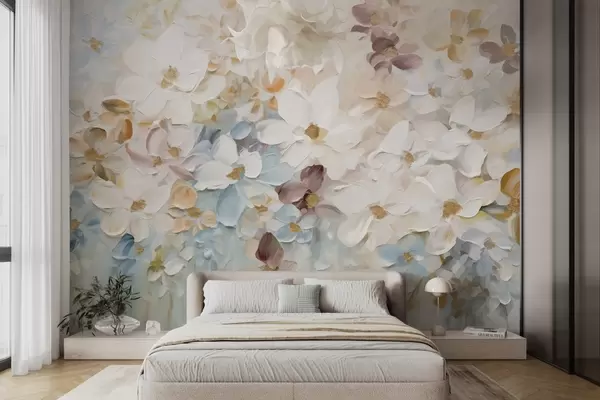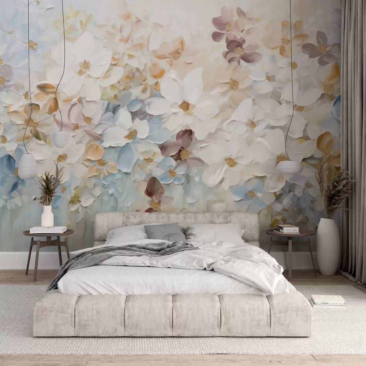Carta da parati Pittura a olio che imita un giardino fiorito con fiori bianchi, blu e arancioni, pennellate morbide, colori pastello smorzati nr. w09236v1