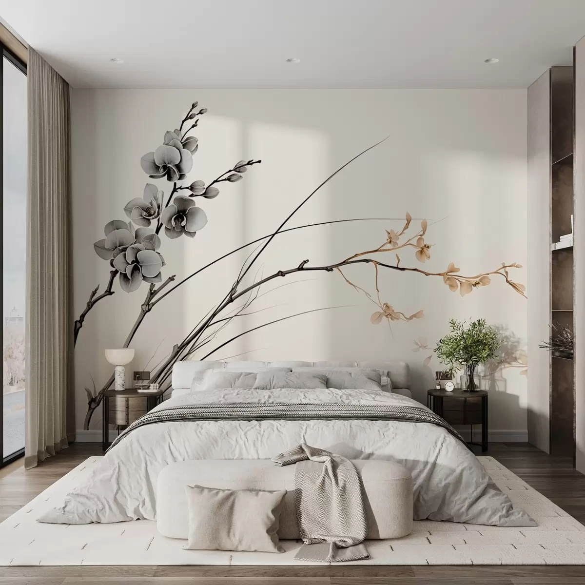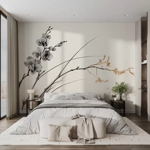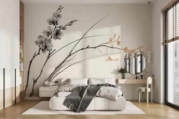 Carta da parati Ramo di orchidea minimalista in tenui toni seppia e grigi nr. w09250