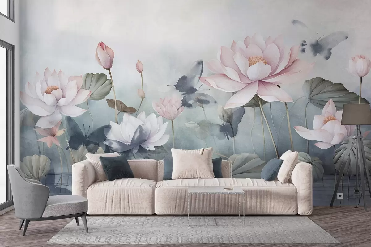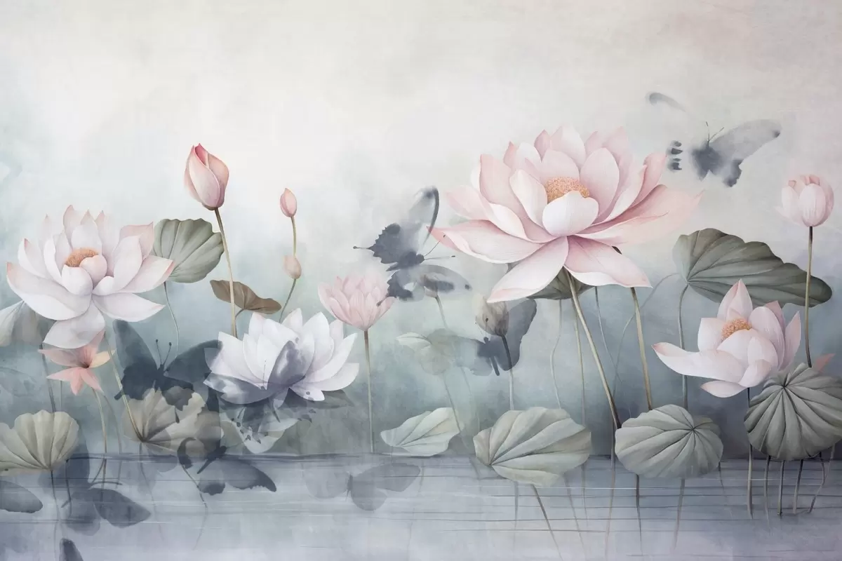 Carta da parati Fiori di loto con petali rosa pastello, foglie verdi, riflesso dell'acqua, colori pastello tenui, effetto acquerello nr. w09254