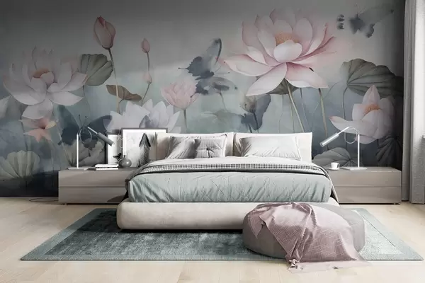 Carta da parati Fiori di loto con petali rosa pastello, foglie verdi, riflesso dell'acqua, colori pastello tenui, effetto acquerello nr. w09254