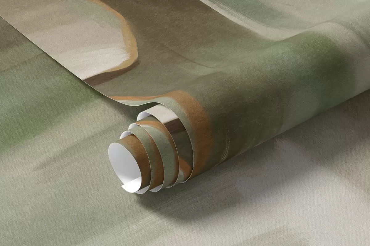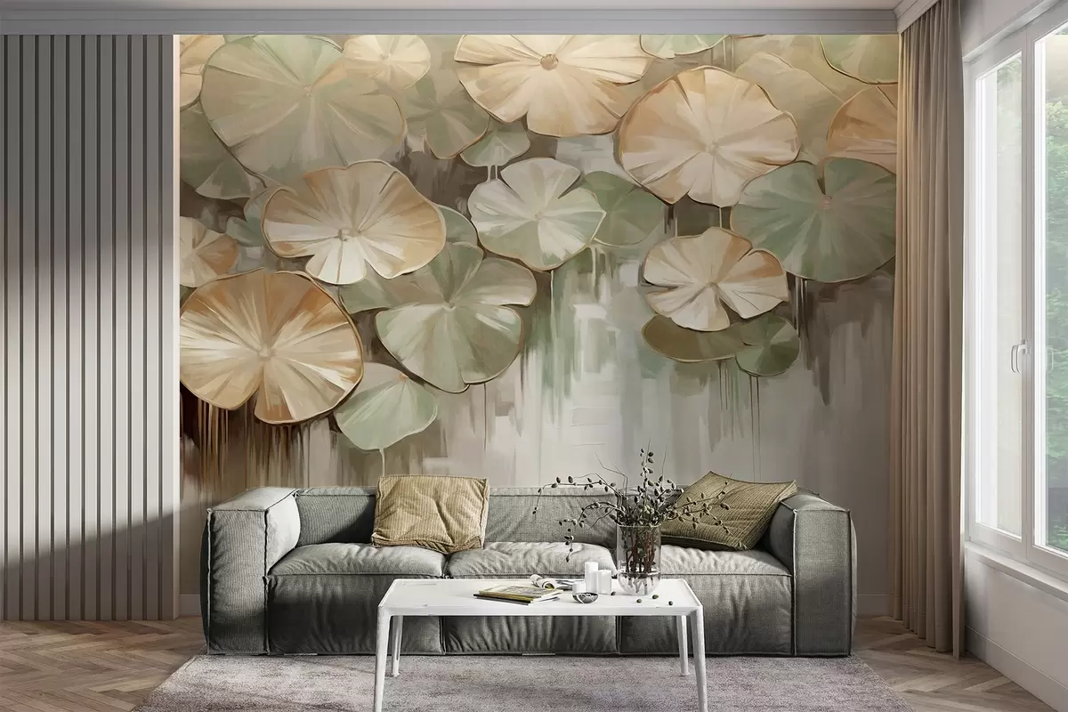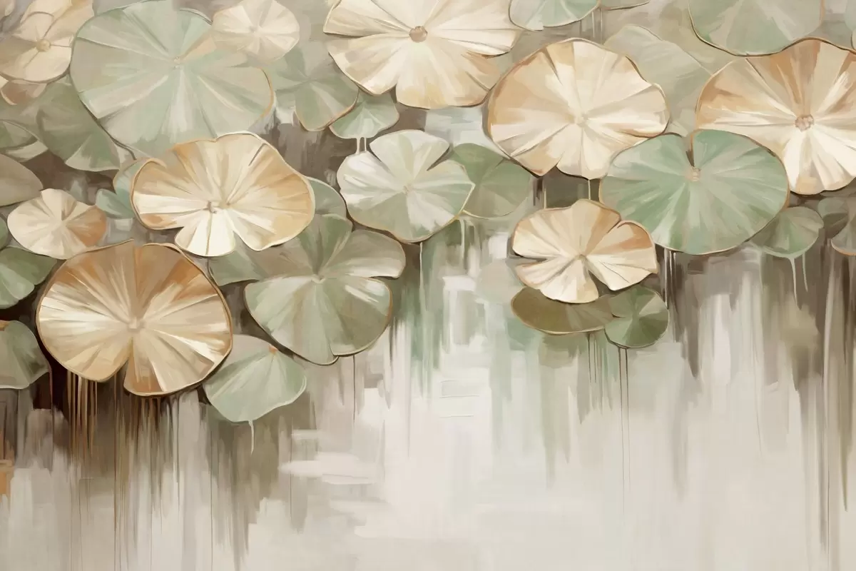 Carta da parati Ninfee strutturate con colori verdi e beige in uno stagno, lo sfondo è una miscela sfocata di bianco, verde e marrone nr. w09255
