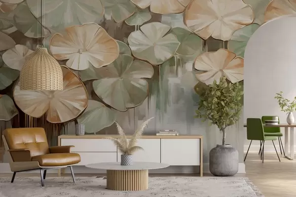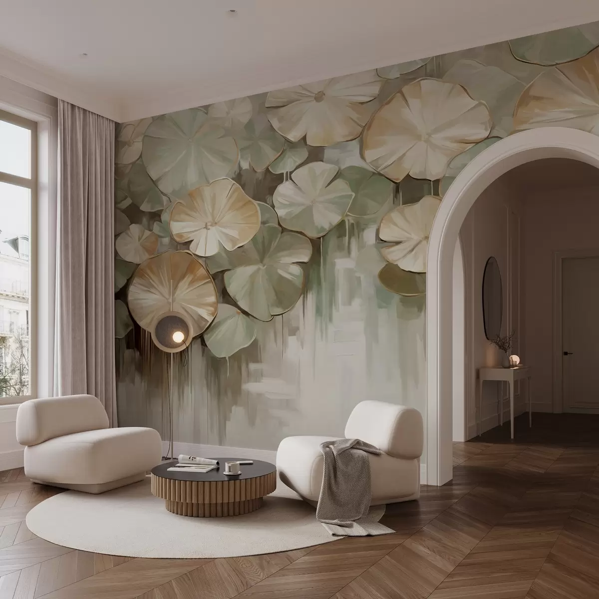 Carta da parati Ninfee strutturate con colori verdi e beige in uno stagno, lo sfondo è una miscela sfocata di bianco, verde e marrone nr. w09255