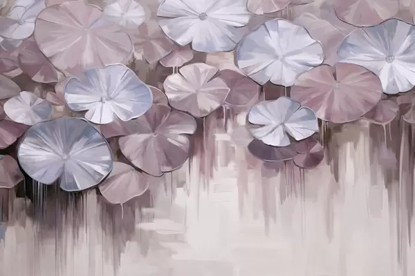 Carta da parati Ninfee strutturate con colori viola e blu in uno stagno, lo sfondo è una miscela sfocata di morbide tonalità di viola nr. w09255v1