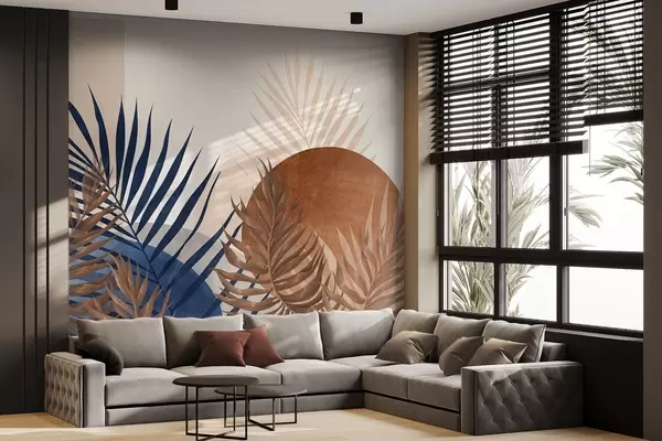 Carta da parati Composizione astratta con foglie tropicali nei toni del blu e della terra, con una grande forma circolare nr. w09257