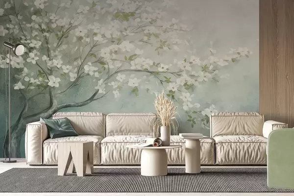 Carta da parati Un albero in fiore con fiori bianchi in piena fioritura, su uno sfondo granuloso e rumoroso di colore blu e verde tenue nr. w09261