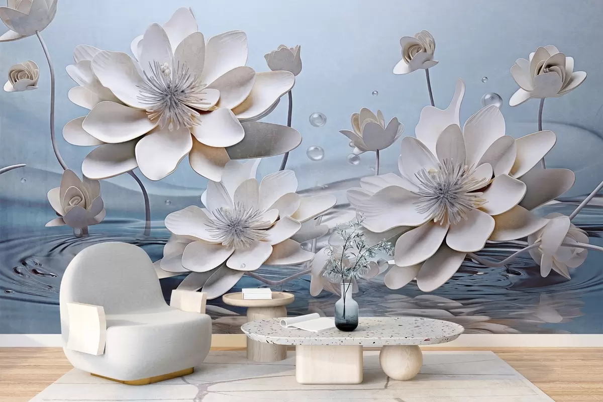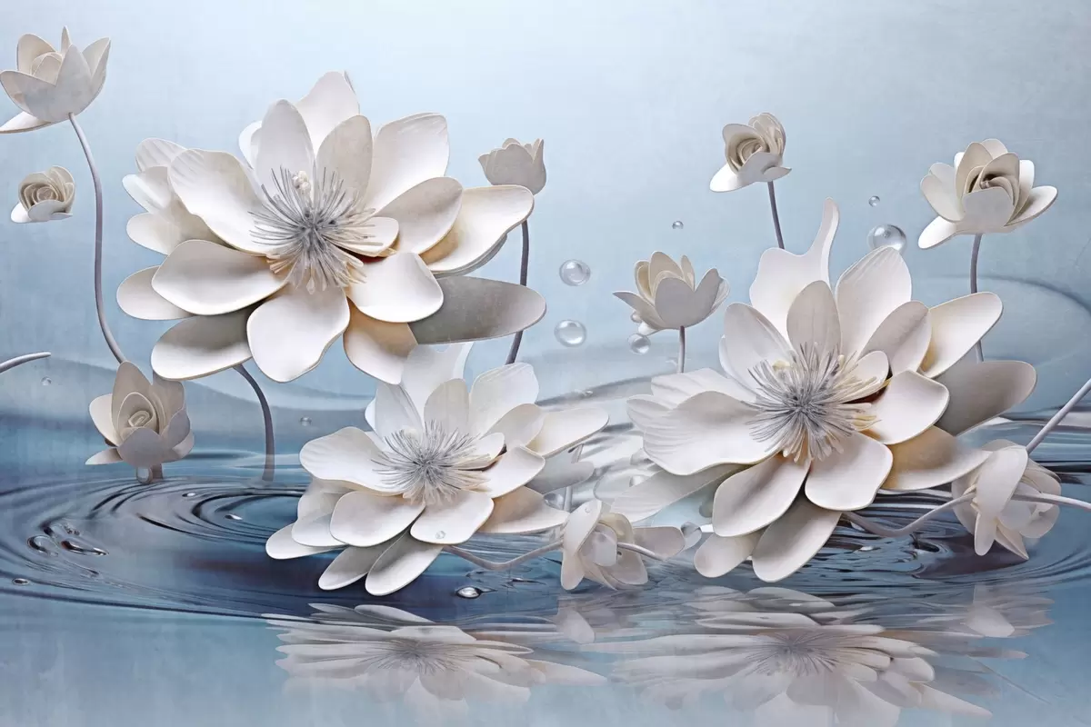 Carta da parati Fiori bianchi strutturati con gocce d'acqua, riflessi sulla superficie dell'acqua, sfondo azzurro, design elegante nr. w09262