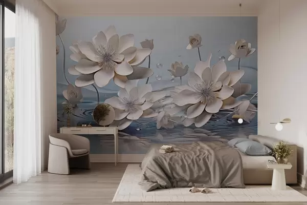 Carta da parati Fiori bianchi strutturati con gocce d'acqua, riflessi sulla superficie dell'acqua, sfondo azzurro, design elegante nr. w09262