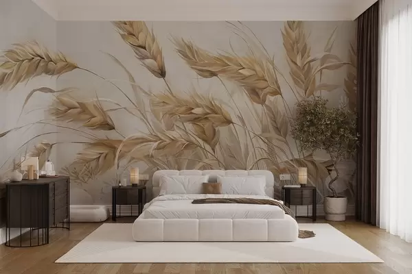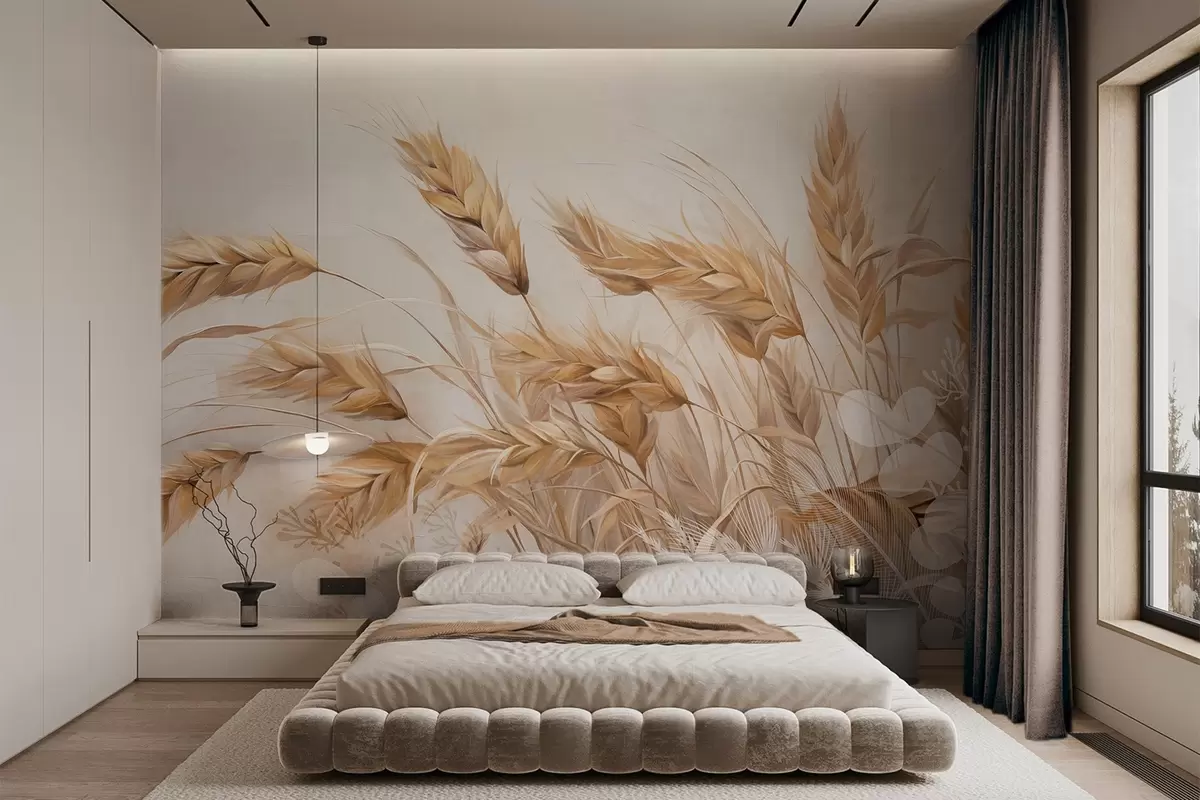 Carta da parati Campo di grano con spighe beige che ondeggiano al vento, colori tenui e smorzati che creano un senso di calore nr. w09264