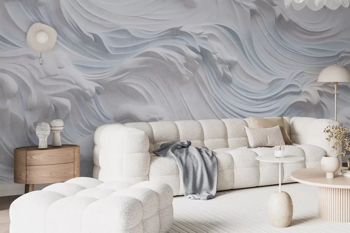 Carta da parati Onde oceaniche astratte testurizzate bianche e azzurre con schiuma, che scorrono da sinistra a destra, stampa dinamica e testurizzata nr. w09266