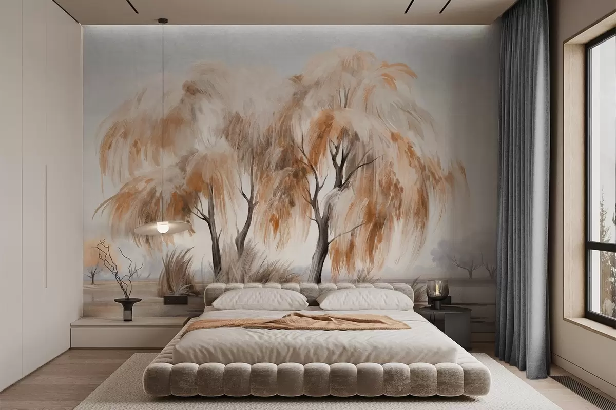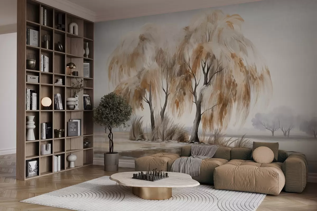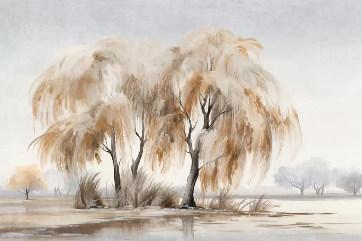 Carta da parati Salici strutturati con foglie bianche e marroni sulla riva di un lago, con dell'erba intorno, in una giornata nebbiosa nr. w09268