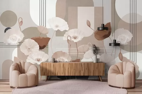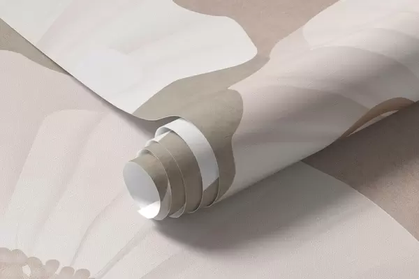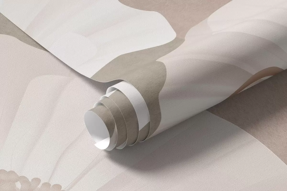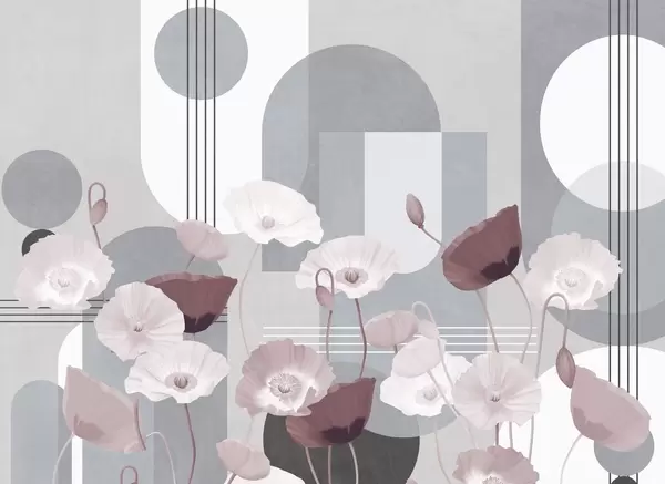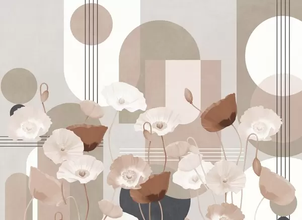 Carta da parati Papaveri nei colori bianco e beige con forme geometriche sullo sfondo, cerchi e archi, stile minimalista, colori tenui nr. w09289