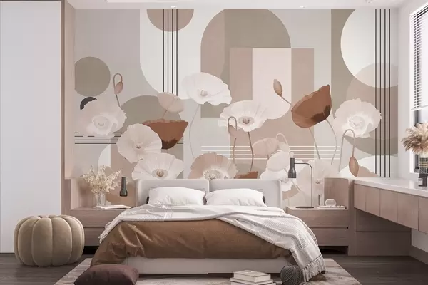 Carta da parati Papaveri nei colori bianco e beige con forme geometriche sullo sfondo, cerchi e archi, stile minimalista, colori tenui nr. w09289