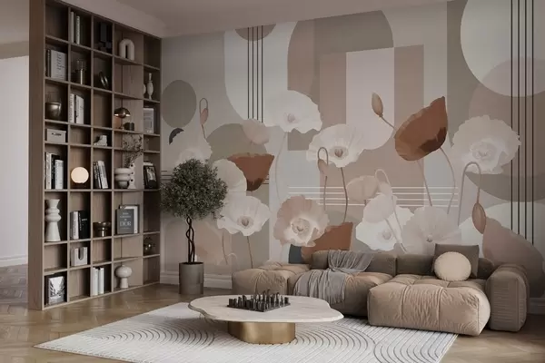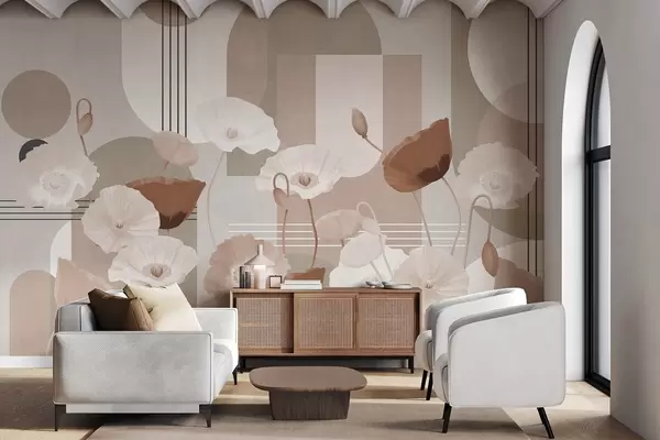 Carta da parati Papaveri nei colori bianco e beige con forme geometriche sullo sfondo, cerchi e archi, stile minimalista, colori tenui nr. w09289