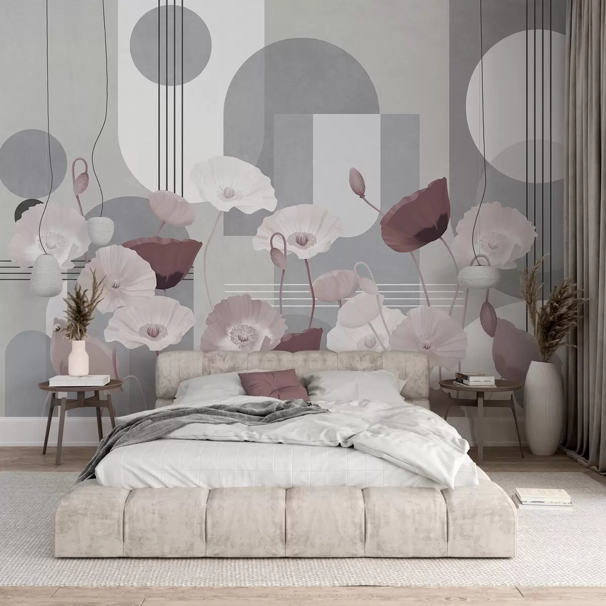 Carta da parati Papaveri nei colori bianco e grigio con forme geometriche sullo sfondo, cerchi e archi, stile minimalista, colori tenui nr. w09289v1