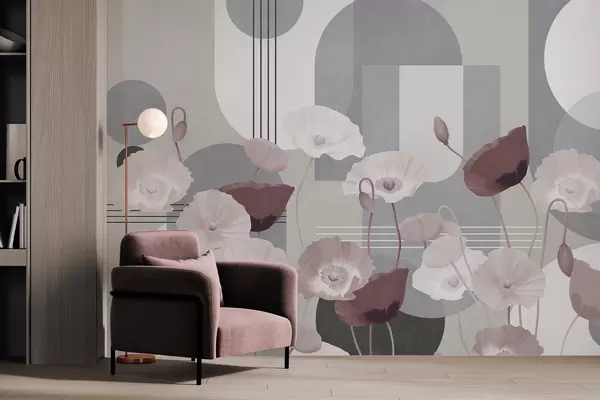 Carta da parati Papaveri nei colori bianco e grigio con forme geometriche sullo sfondo, cerchi e archi, stile minimalista, colori tenui nr. w09289v1