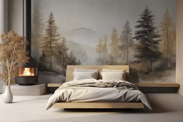 Carta da parati Foresta autunnale strutturata con alti pini e montagne sullo sfondo, i colori sono tenui e terrosi stile pittura nr. w09290