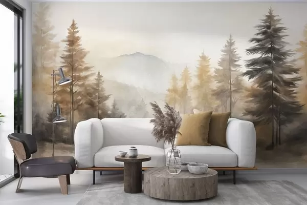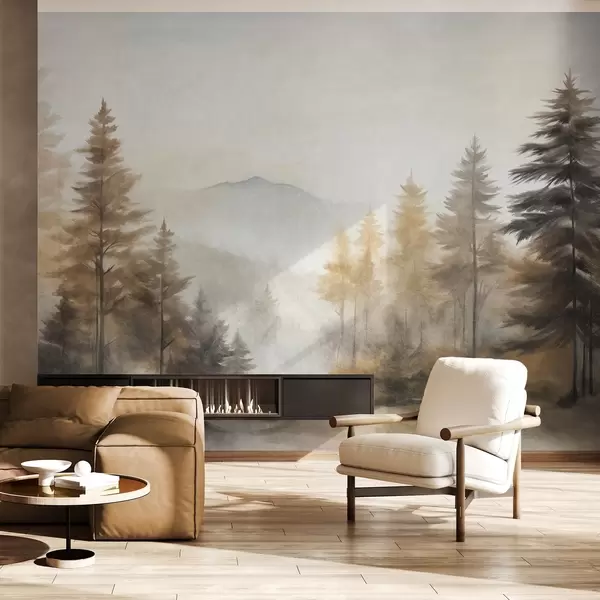 Carta da parati Foresta autunnale strutturata con alti pini e montagne sullo sfondo, i colori sono tenui e terrosi stile pittura nr. w09290