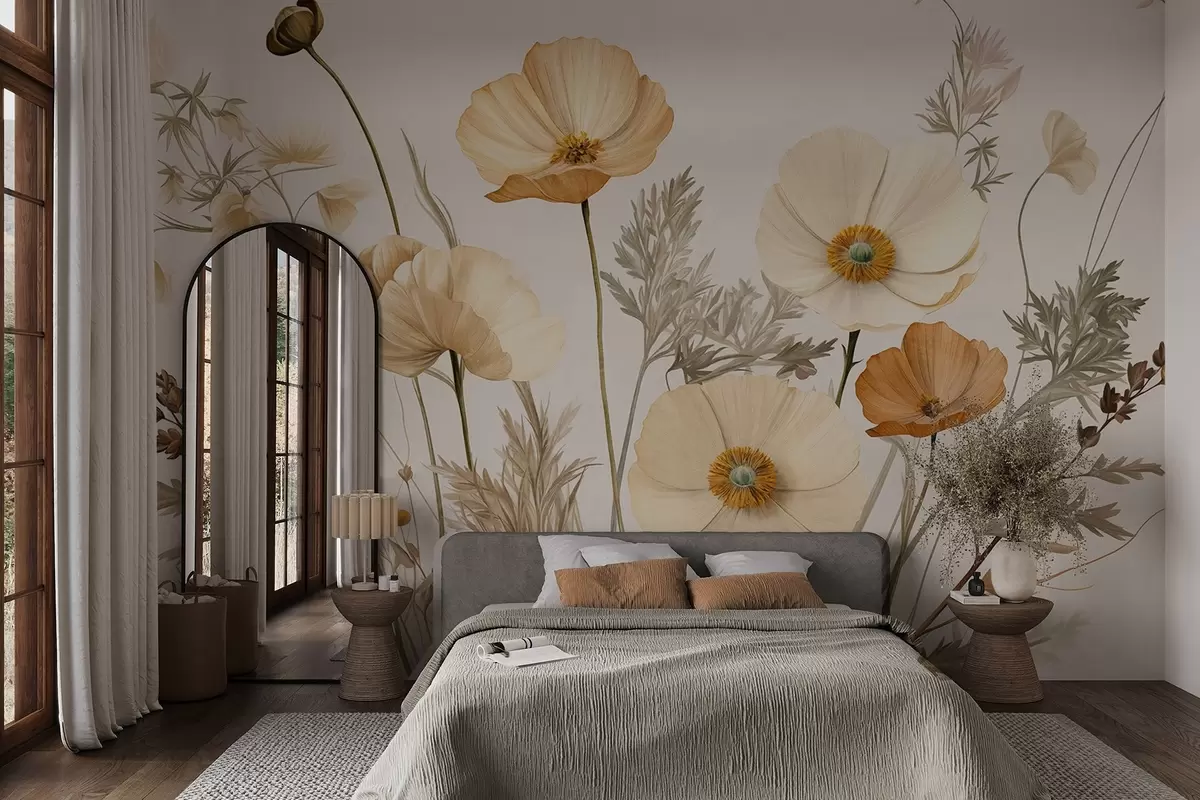 Carta da parati Papaveri arancioni e bianchi dalla texture vintage con steli e foglie sottili, sfondo beige chiaro, stile acquerello nr. w09293