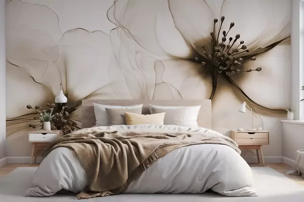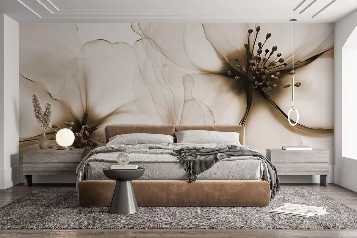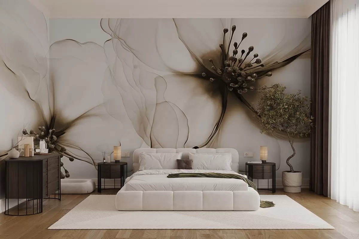 Carta da parati Due fiori marroni dalla texture traslucida con stami visibili, petali delicati che si sovrappongono e una consistenza morbida e fluida nr. w09295