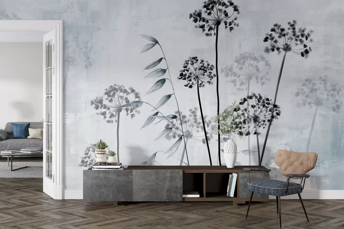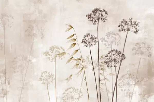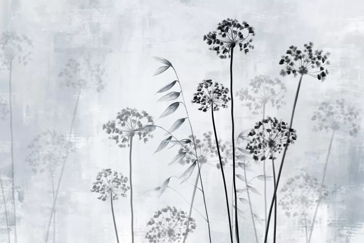 Carta da parati Disegno di fiori secchi con steli lunghi, tavolozza monocromatica, su sfondo grigio chiaro e strutturato, illustrazione botanica nr. w09314