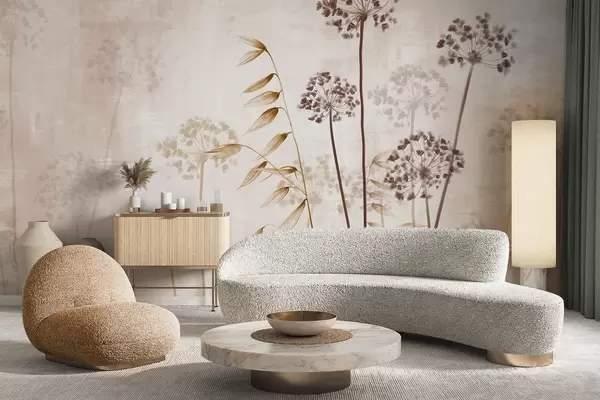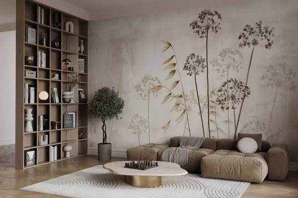 Carta da parati Disegno di fiori secchi con steli lunghi, tavolozza monocromatica, su sfondo beige chiaro e strutturato, illustrazione botanica nr. w09314v1