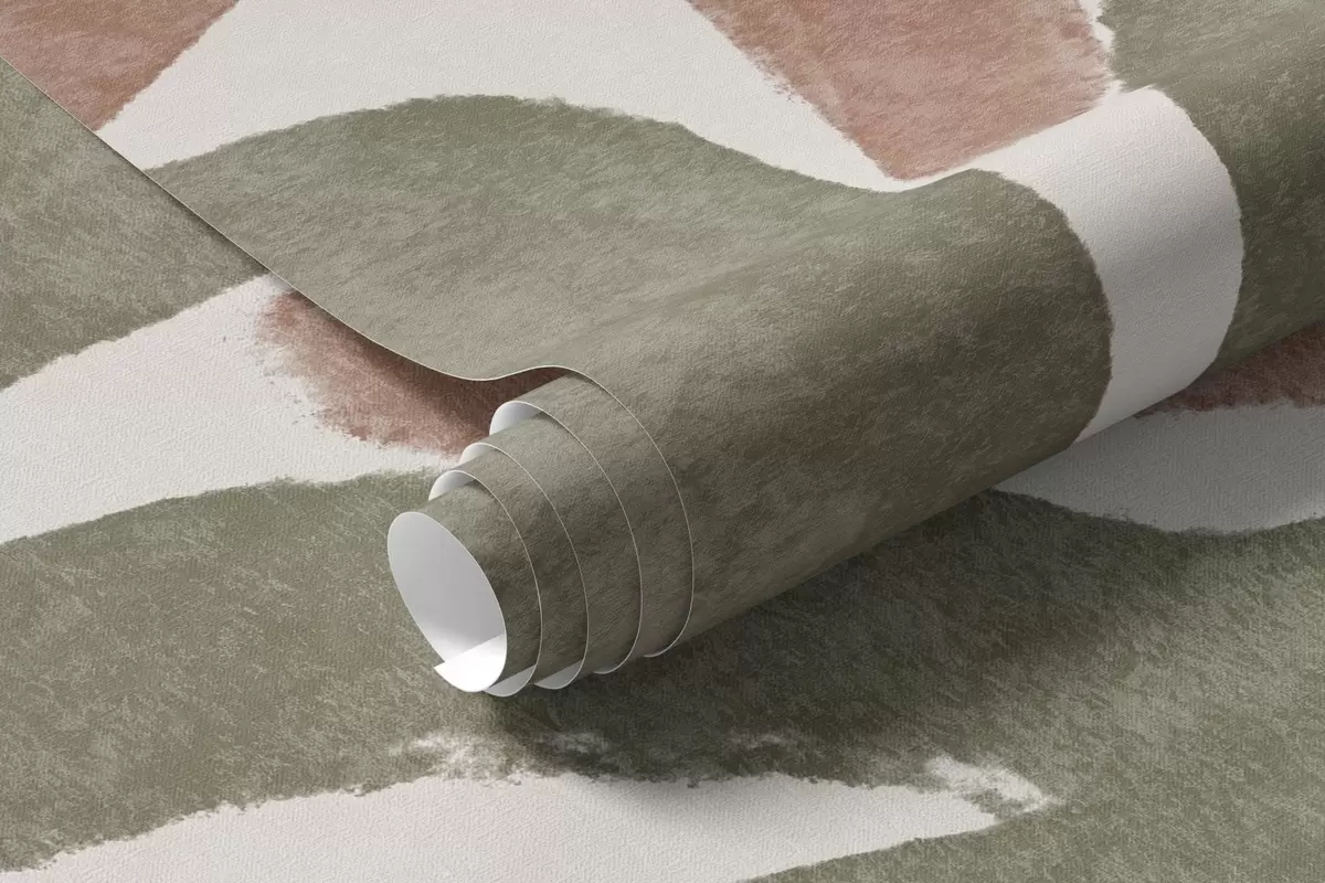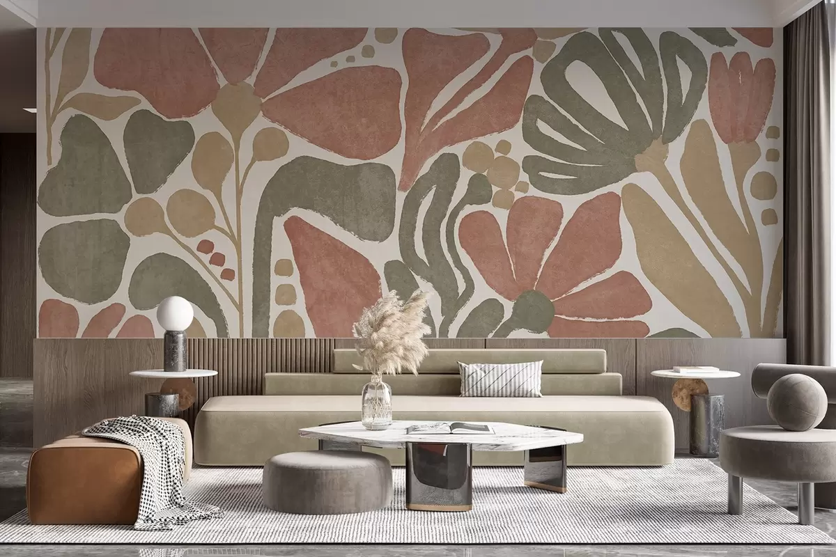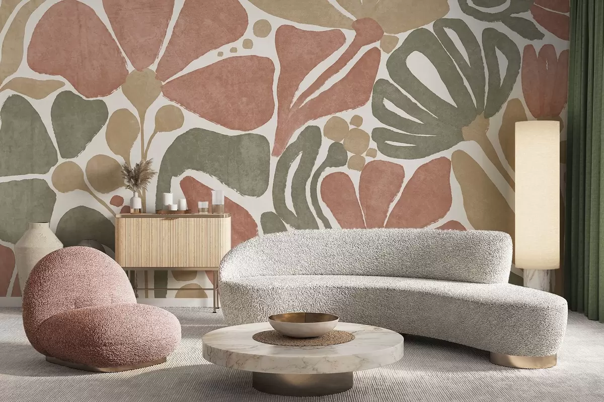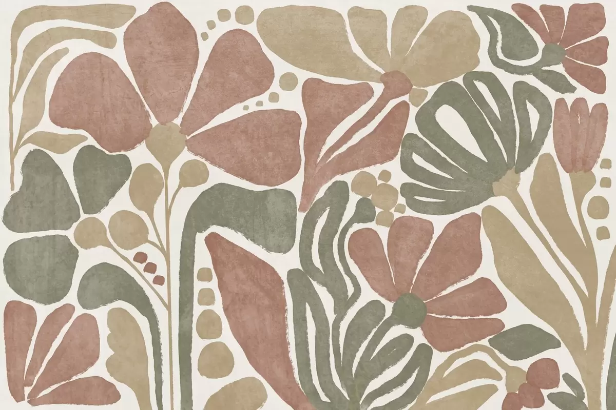 Carta da parati Fiori astratti nei toni del rosso, del verde e del beige, con uno sfondo chiaro, in un design piatto e stilizzato, moderno e minimalista nr. w09315