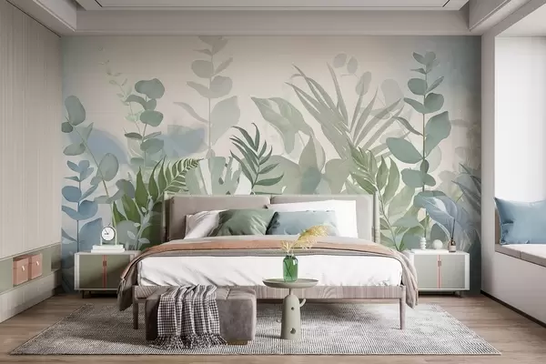 Carta da parati Piante verdi pastello, felci, monstera ed eucalipto, sfondo leggero e strutturato, illuminazione soffusa, tranquillità, illustrazione botanica nr. w09316