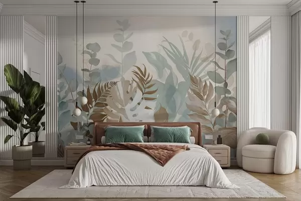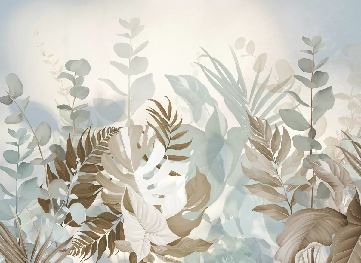Carta da parati Piante pastello, felci, monstera ed eucalipto, sfondo leggero e strutturato, illuminazione soffusa, tranquillità, illustrazione botanica nr. w09316v1