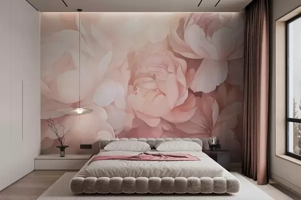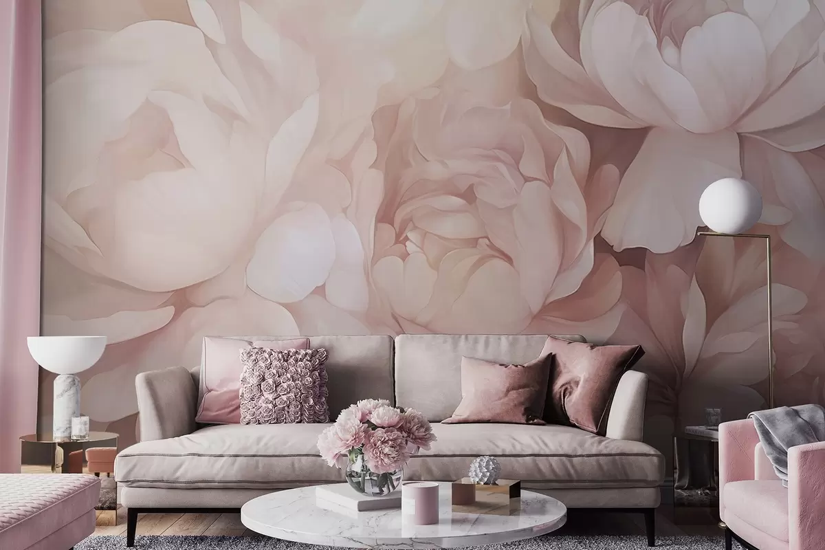 Carta da parati Peonie rosa pastello chiaro con petali delicati e morbidi, disposti a stretto contatto l'uno con l'altro, creando un'arte floreale densa, illuminazione soffusa nr. w09319